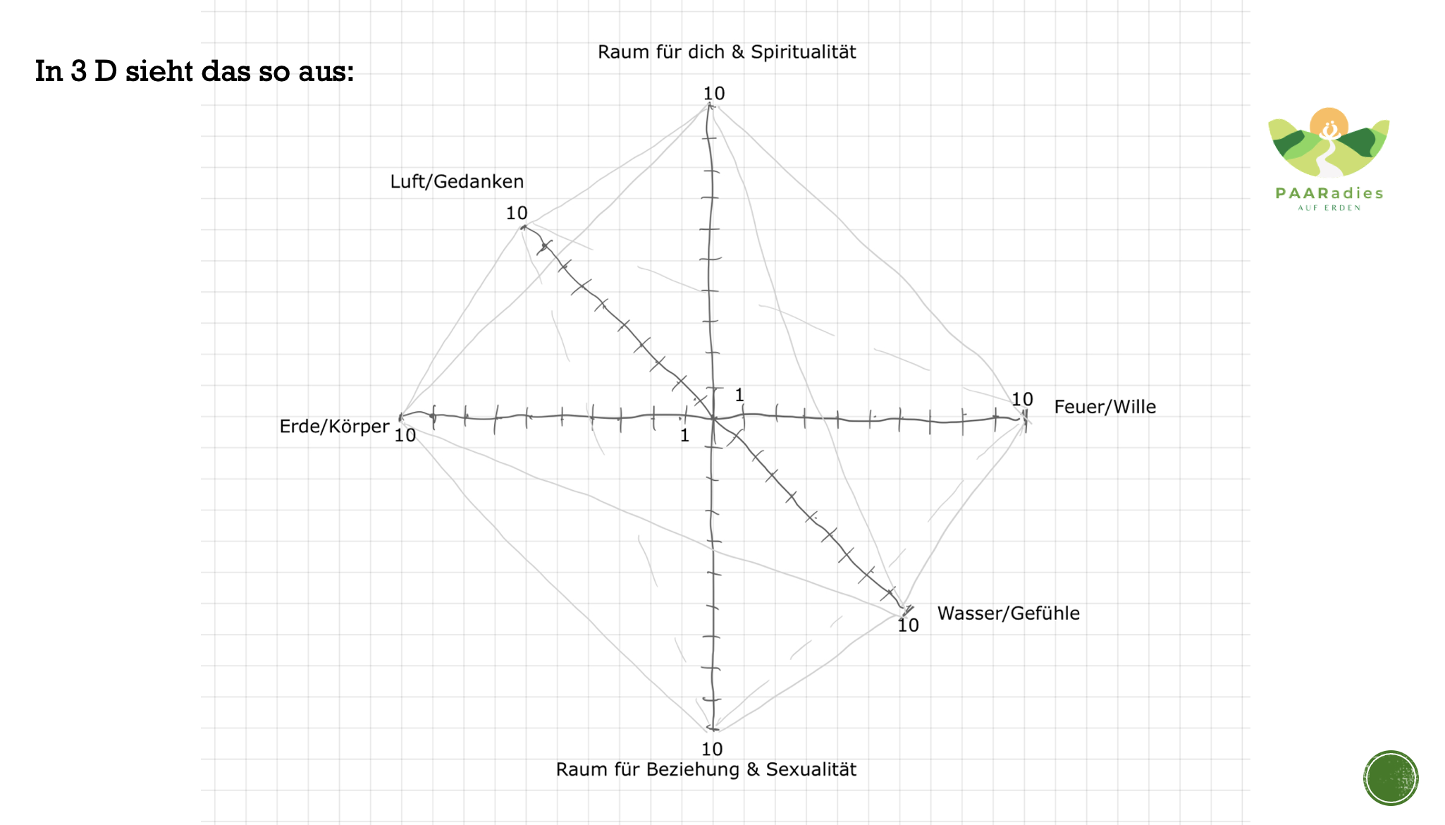 Trag jetzt bitte den Mittelwert aus deinen beiden Antworten in diese Grafik ein. Also, wenn du z.B. wie stark ist deine Verbindung mit dem Feuer? eine drei eingetragen hast und wie stark und rein ist dein Wille eine sechs, dann teilst du 6+3=9/2 wäre eine 4,5. Das heißt, du trägst dann auf dieser Achse, auf der Feuerachse eine 4,5 ein.