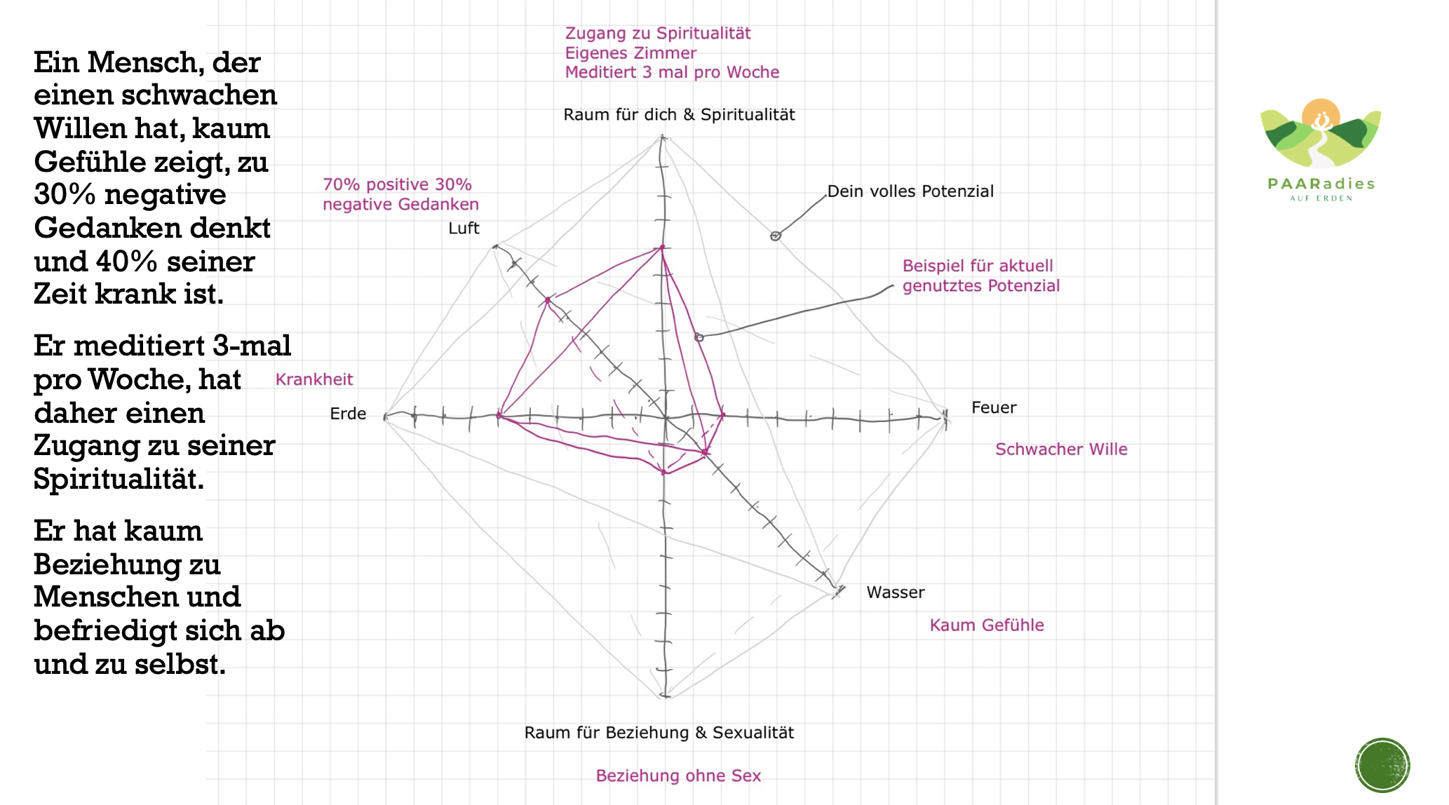 Das ist ein Mensch, der einen schwachen Willen hat, kaum Gefühle zeigt, zu 30% negative Gedanken denkt und 40% seiner Zeit krank ist. Er meditiert dreimal pro Woche, hat daher einen Zugang zu seiner Spiritualität. Er hat kaum Beziehung zu Menschen und befriedigt sich ab und zu selbst. Dieser Mensch hat nun auf den Skalen eingetragen, wie viel von 1 bis 10 auf der jeweiligen Achse an Potential gelebt wird. Also z.B. auf der Achse Raum für dich und Spiritualität schätzt er sich mit dem Wert sechs ein auf der Achse Wille und Feuer schätzt er sich mit zwei ein, weil er einen schwachen Willen hat. Auf der Achse Beziehung und Sexualität schätzt er sich mit zwei ein. Auf der Achse der Gefühle schätzt er sich mit zwei ein. da er wenig Gefühle zeigt. Auf der Achse Körper schätze er sich mit sechs ein, da er 40% seiner Zeit krank ist und auf der Achse der Gedanken mit sieben, da er nur 30% negative Gedanken denkt und auf der Achse der Spiritualität und des Meditierens mit dem Wert sechs. Wenn man jetzt diese Punkte eingetragen hat, dann kann man Linien zeichnen und die Pyramide einzeichnen. Genauso die nach unten. Und dann siehst du dein Potential und du siehst hier das maximal mögliche Potential.